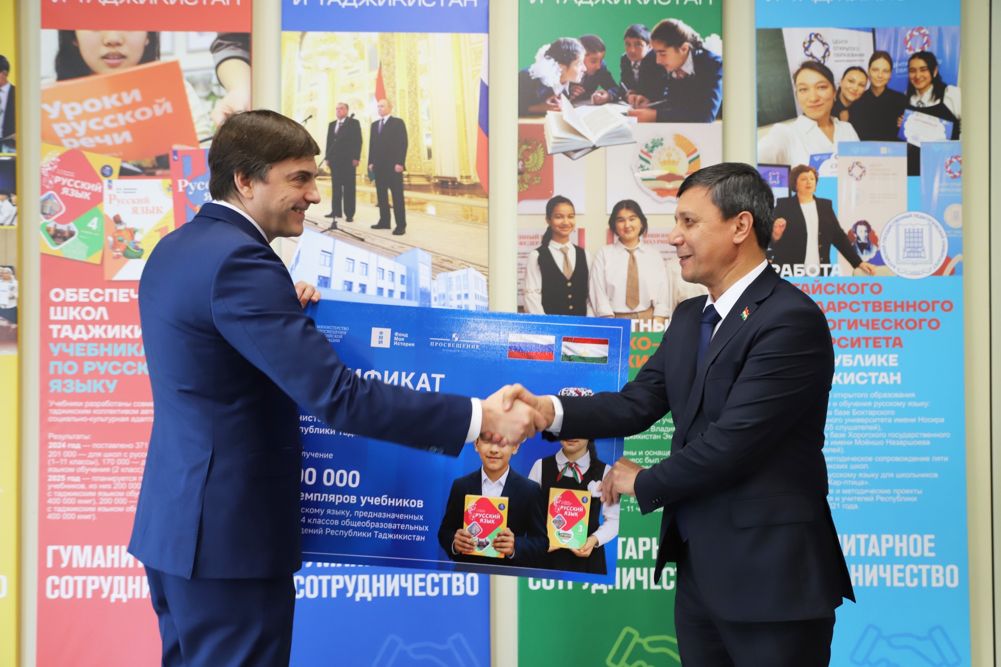 Министр просвещения Российской Федерации Сергей Кравцов посетил с рабочей поездкой Республику Таджикистан. Он осмотрел совместную российско-таджикскую школу с углубленным изучением отдельных предметов в г. Душанбе имени Ю.А. Гагарина, а также принял участие в торжественной церемонии передачи сертификата на более чем 800 тыс. учебников.